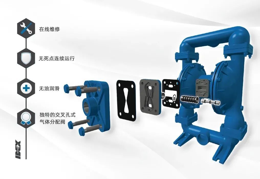A)氣動隔膜泵無法啟動或動作緩慢 i 檢查過濾、調壓和潤滑裝置和空氣入口過濾網是否被堵塞。 ii 檢查氣閥是否被雜質卡住,請將氣閥拆下并清洗干凈,查看氣閥內的活塞是否有劃 傷的痕跡。如果活塞表面光亮而不黑純,表示已磨損需要更換活塞和“O”型環。傷的 痕跡。如果活塞表面光亮而不黑純,表示已磨損需要更換活塞和“O”型環。請重新更換新品 iii 檢查主軸和“O”型環是否有刮傷、磨損和壓扁的痕跡,如有損壞請更換。